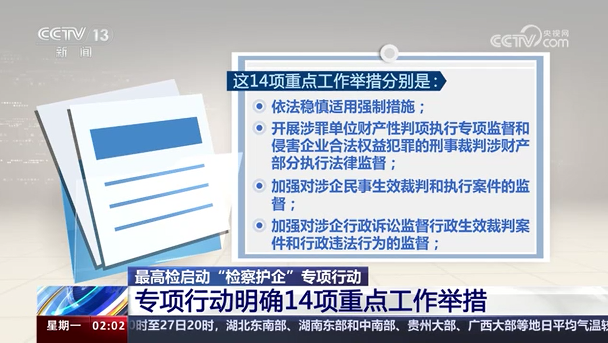 最高檢啟動(dòng)“檢察護(hù)企”專項(xiàng)行動(dòng) 專項(xiàng)行動(dòng)明確14項(xiàng)重點(diǎn)工作舉措
