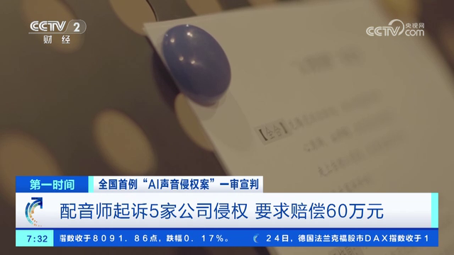 全國首例“AI聲音侵權案”一審宣判 配音師起訴5家公司侵權 要求賠償60萬元