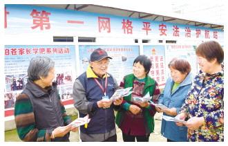 圖為江蘇省啟東市海復(fù)鎮(zhèn)廟基村“法律明白人”倪伯蒼(左二)向群眾普及法律知識(shí)。