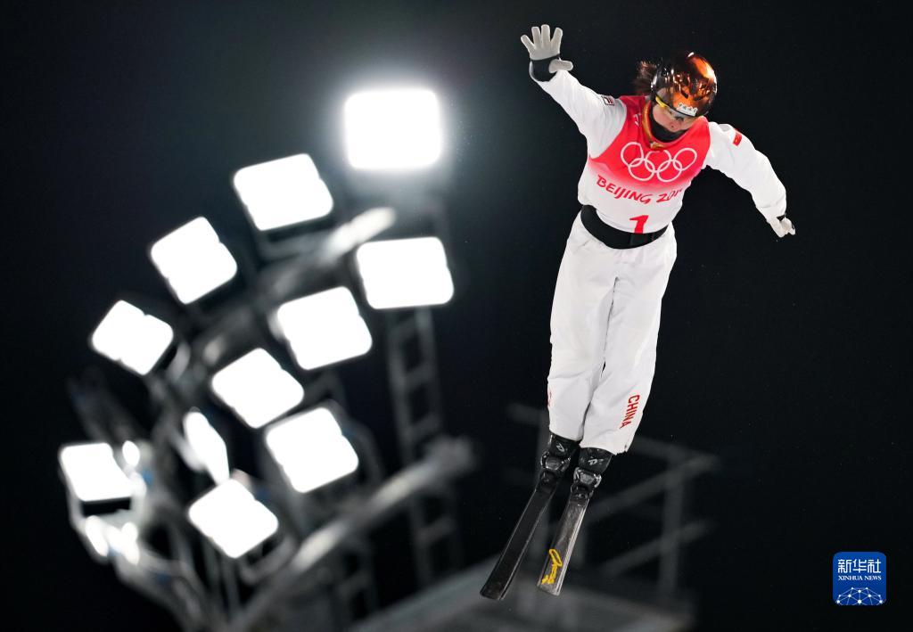 徐夢(mèng)桃在張家口云頂滑雪公園舉行的北京2022年冬奧會(huì)自由式滑雪女子空中技巧決賽中(2022年2月14日攝)。新華社記者 牟宇 攝