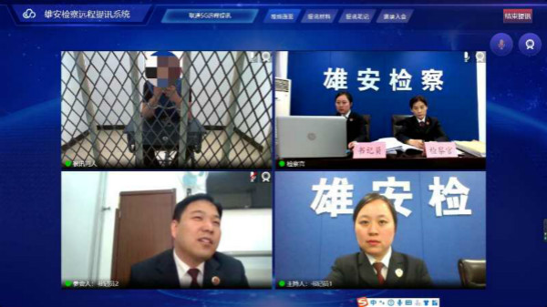 在整個庭審過程中,審判員、檢察官及上訴人身處三地,其中,審判員在雄安新區(qū)中級人民法院法庭,檢察官在檢察院視頻室,上訴人在看守所視頻室,一起通過5G遠(yuǎn)程網(wǎng)絡(luò)視頻共同參與庭審。