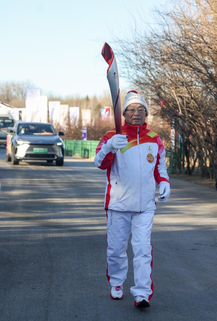 2月2日,北京冬奧會(huì)火炬在北京奧林匹克森林公園傳遞,火炬手葉培建在火炬?zhèn)鬟f中。新華社記者 賈浩成 攝