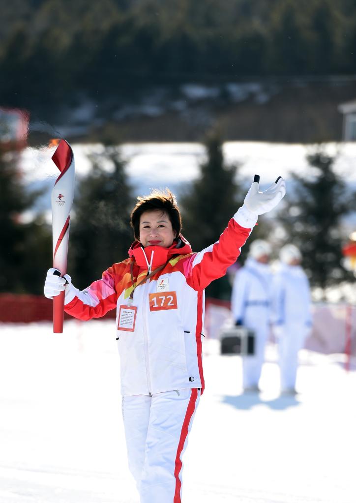 2月3日,北京冬奧會(huì)火炬在河北張家口崇禮富龍滑雪場(chǎng)傳遞,火炬手郭丹丹在火炬?zhèn)鬟f中。新華社記者 駱學(xué)峰 攝